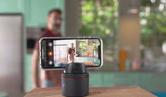 장대를 이용해 스마트폰 카메라를 높은 나뭇가지에 매달아 놓는 장면
