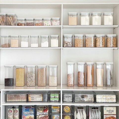 지퍼백이나 냉동식품봉투에 넣어 보관하는 것은 개인적으로 선호하는 방법은 아니지만 가능하면 밀폐용기를 사용하고 있습니다. 저도 예전에 사은품으로 받았던 트레이에 딱 맞는 용기를 사용하고 있어요. 손잡이가 달린 밀폐용기에 손잡이가 있어서 높은 곳에 놓아도 꺼낼 수 있어요. 편하다는 장점도 있지만 손잡이로 인해 수납공간을 많이 차지한다는 단점도 있으니 상황에 맞게 활용하시면 좋을 것 같습니다.